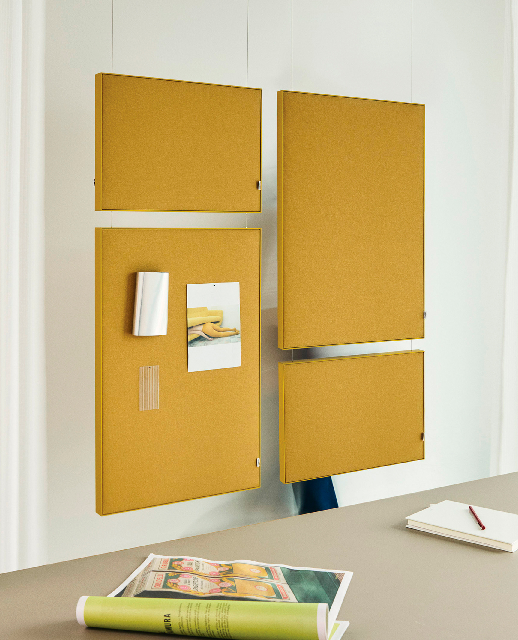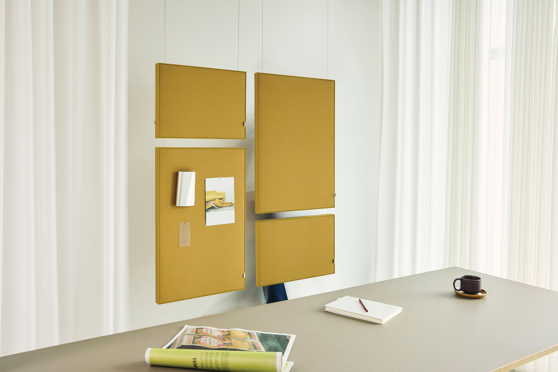 Delivered as a wire-suspended unit, the Vertical Screen enables defined acoustic zoning without occupying floor space. It supports adaptable layouts and spatial separation between workstations or functional areas, without permanent building alterations.