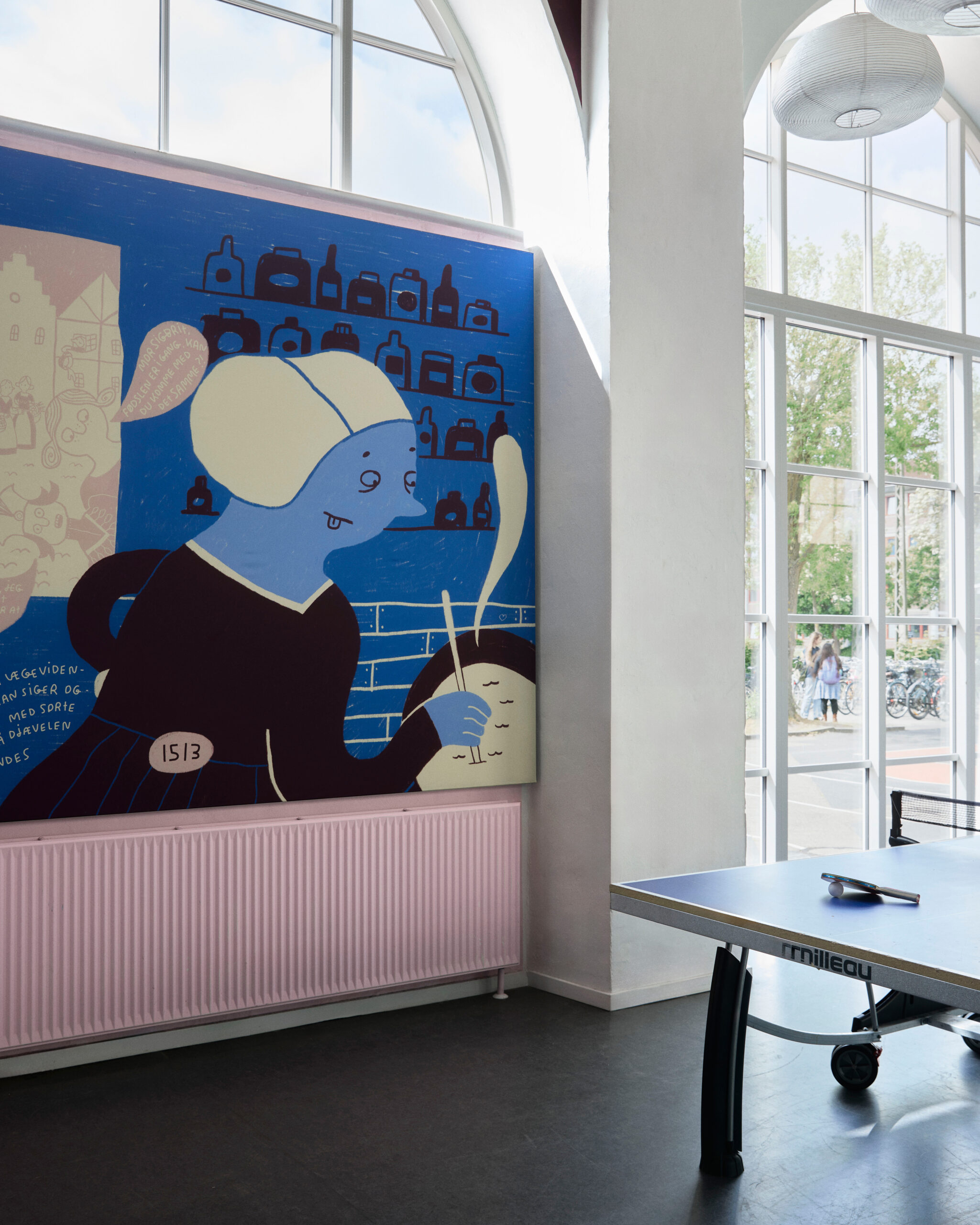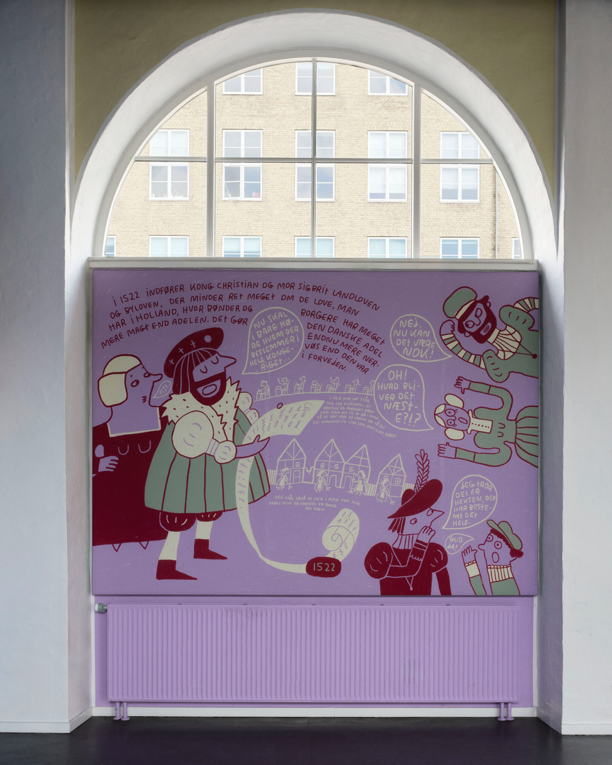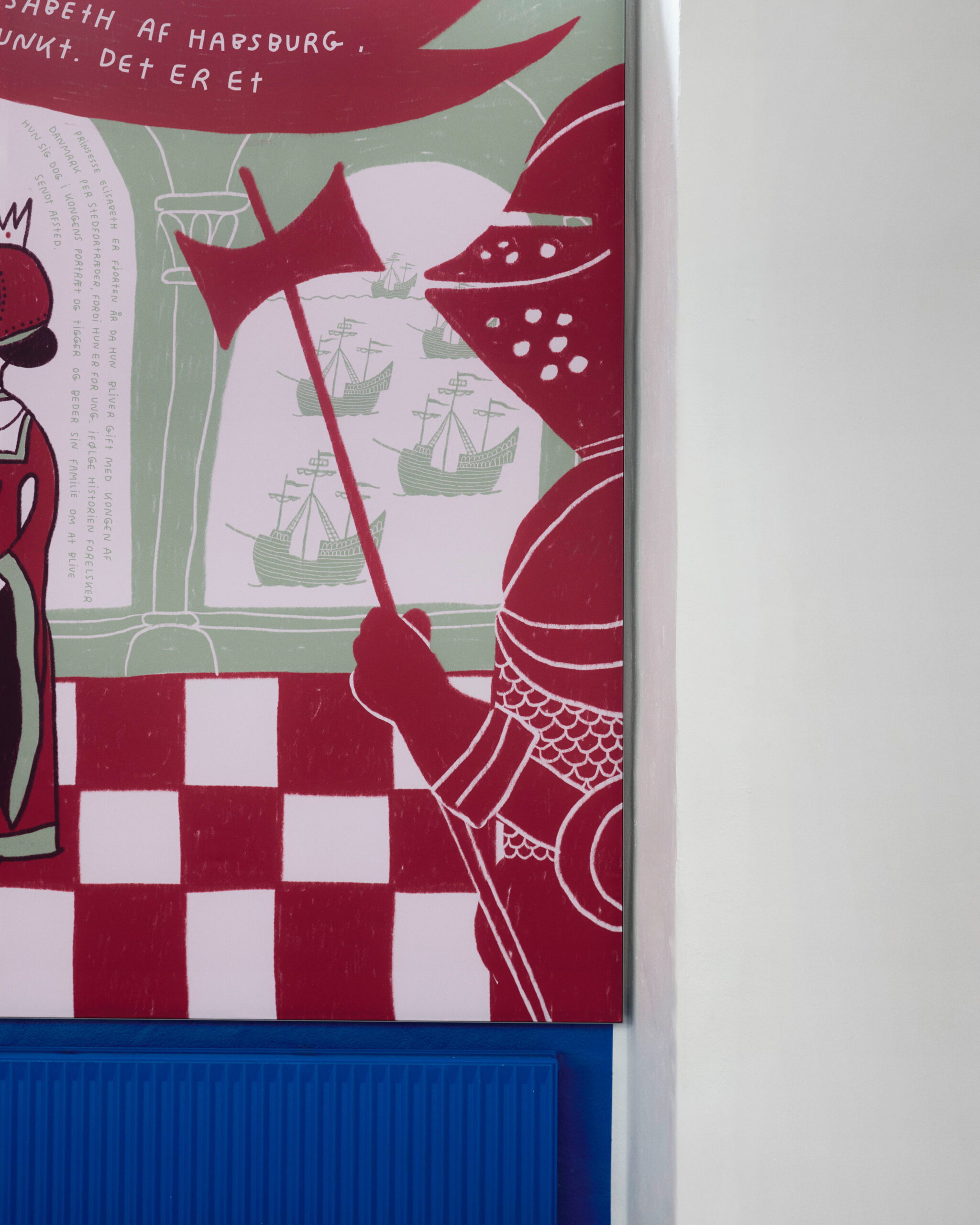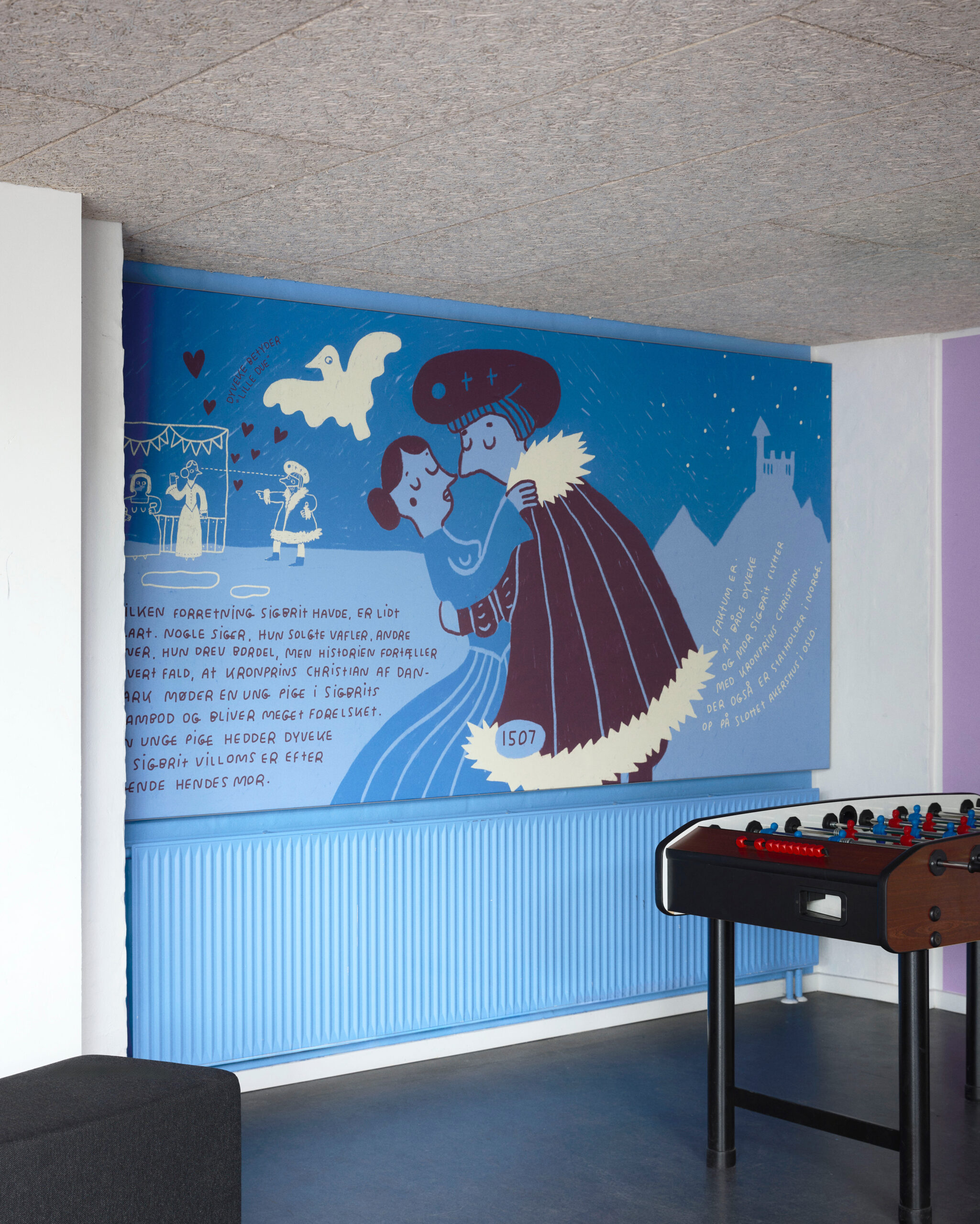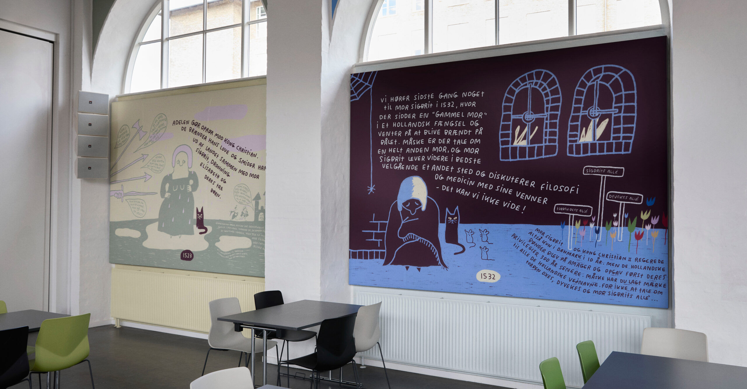 Developed in collaboration with visual artist Line Jensen, the panels interpret the dramatic story of King Christian II and his complex relationship with Sigbrit Willoms and her daughter Dyveke. Far from being merely decorative, the hand-drawn compositions serve as tactile storytelling devices, embedding fragments of Danish history directly into the architectural framework.