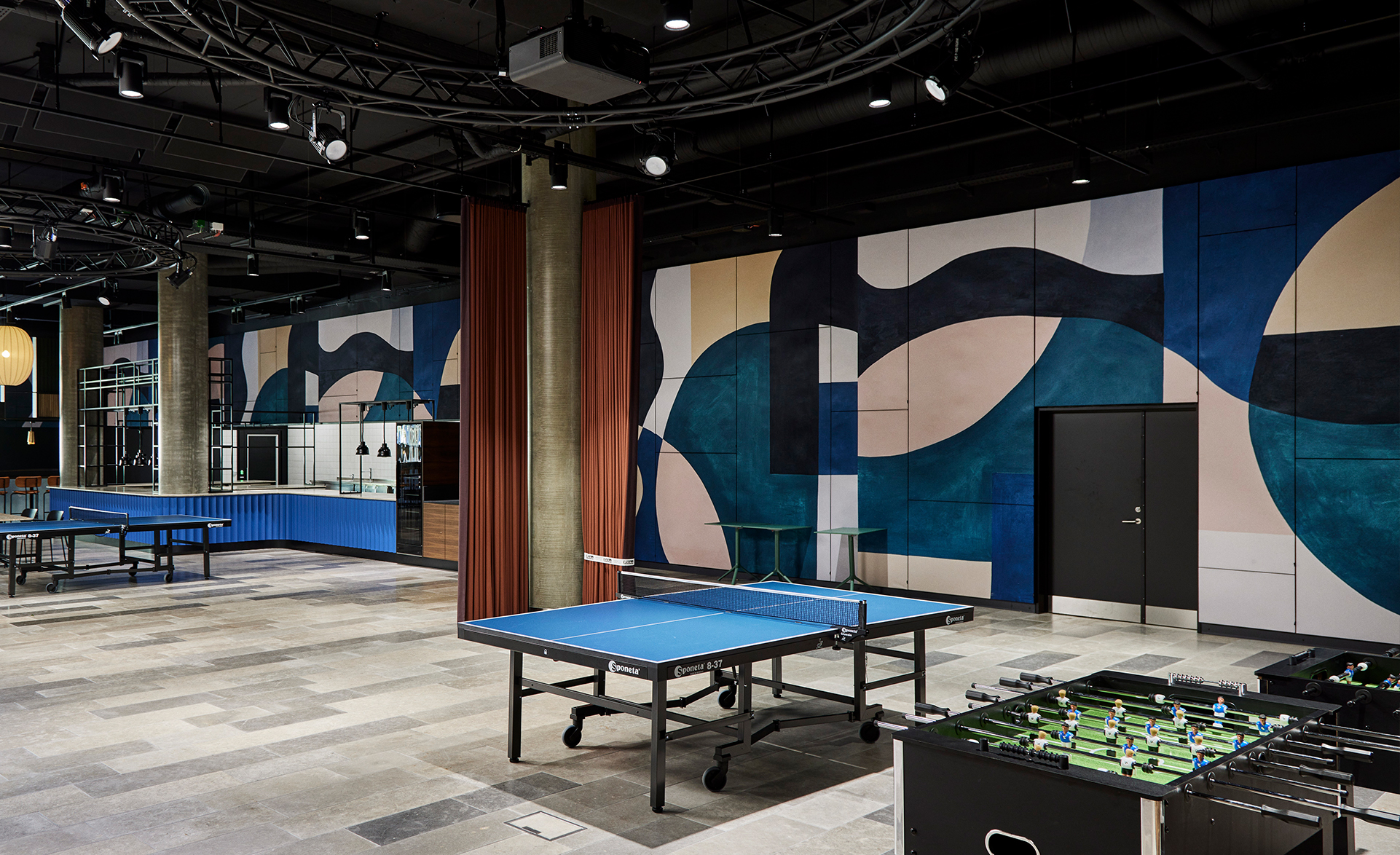 In the large multi-purpose event space, KLP wanted a low reverberation time, which allows them to control the response of the room. The room facilitates a canteen area, casual meeting, foosball, conferences and possibly also concerts.