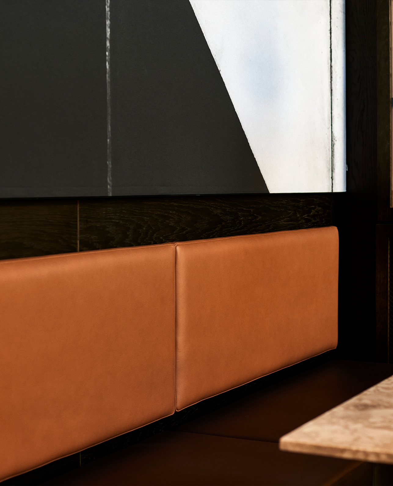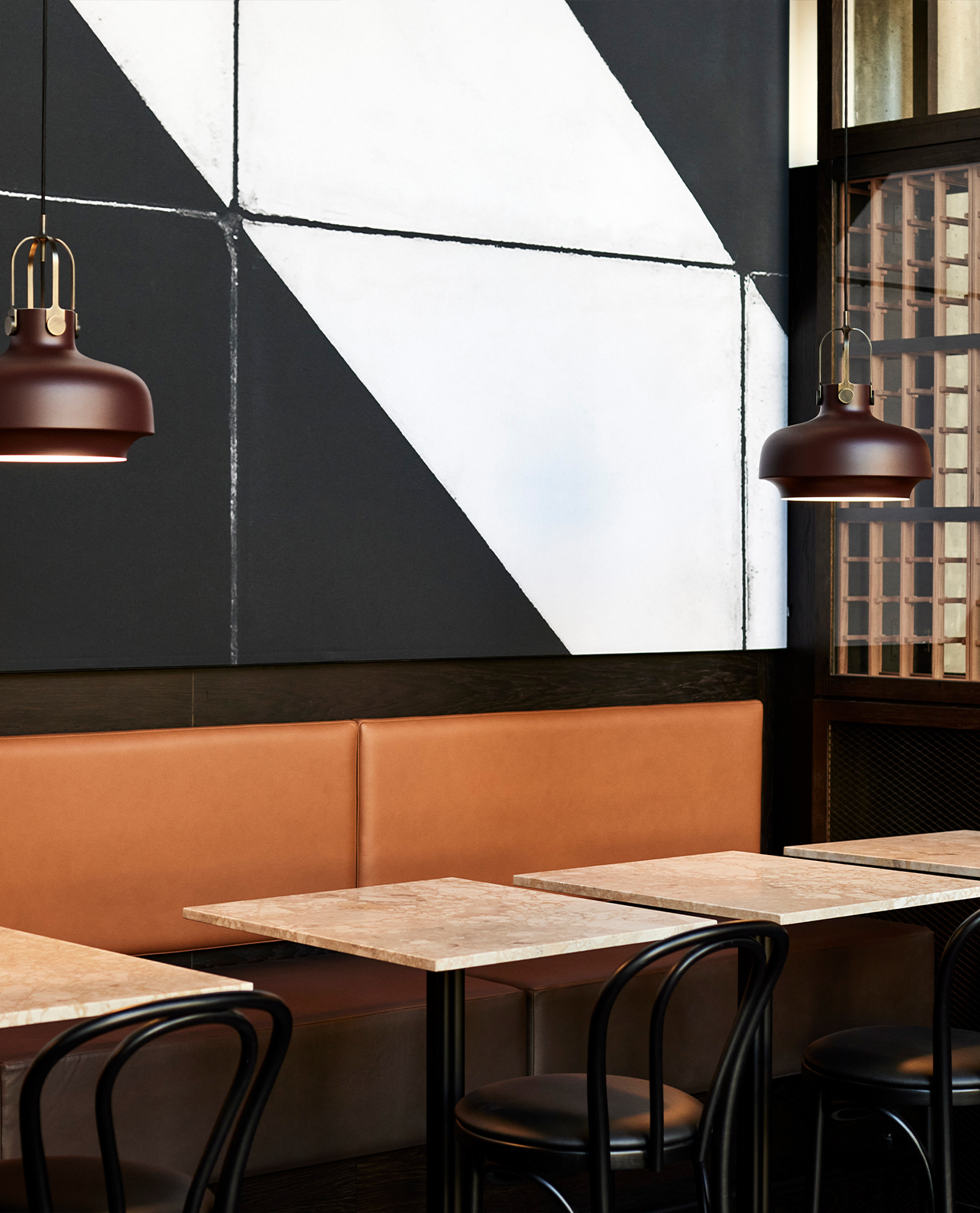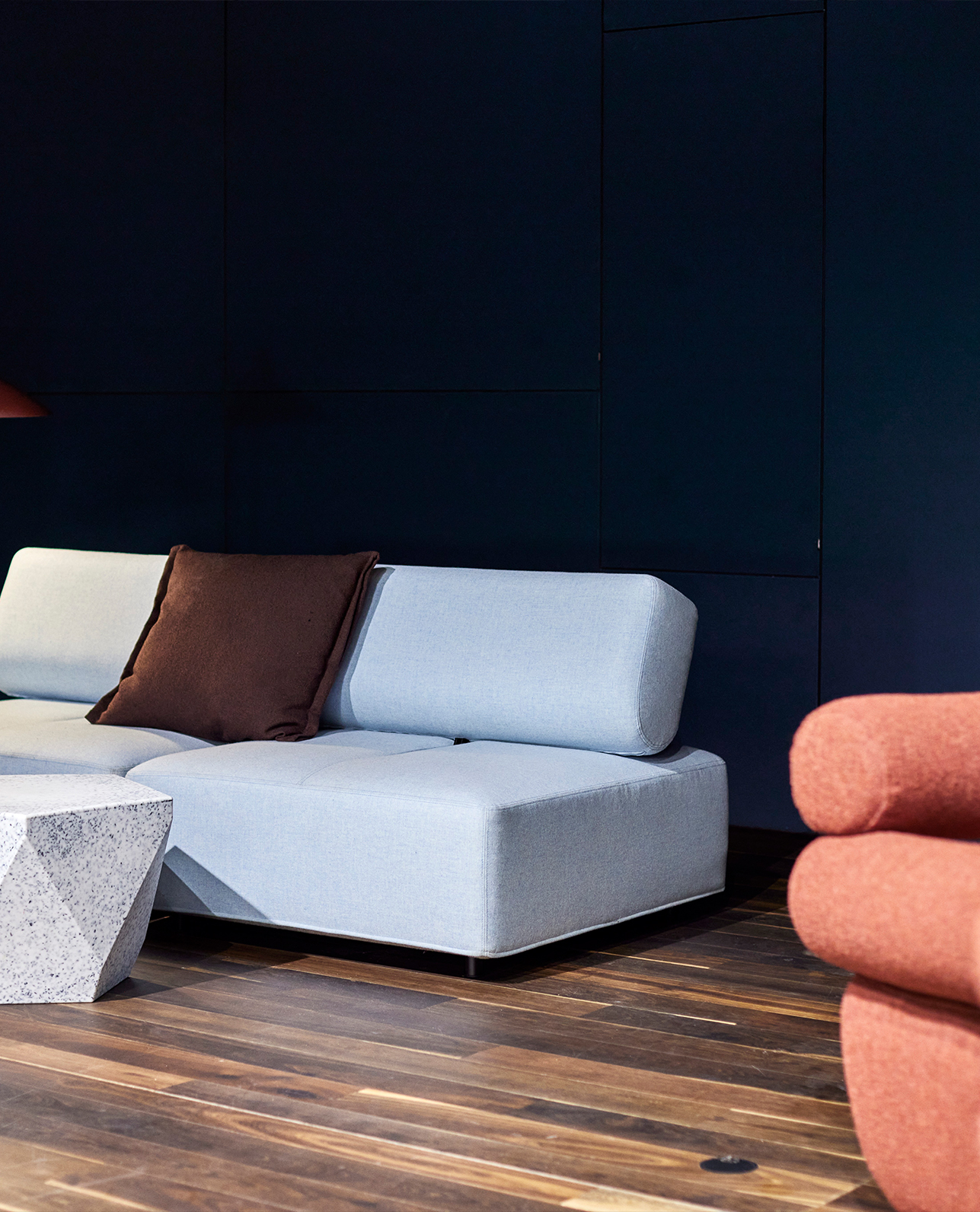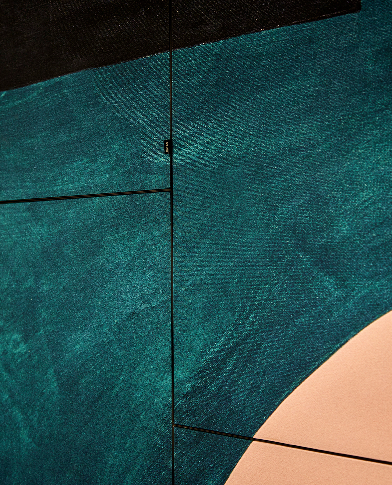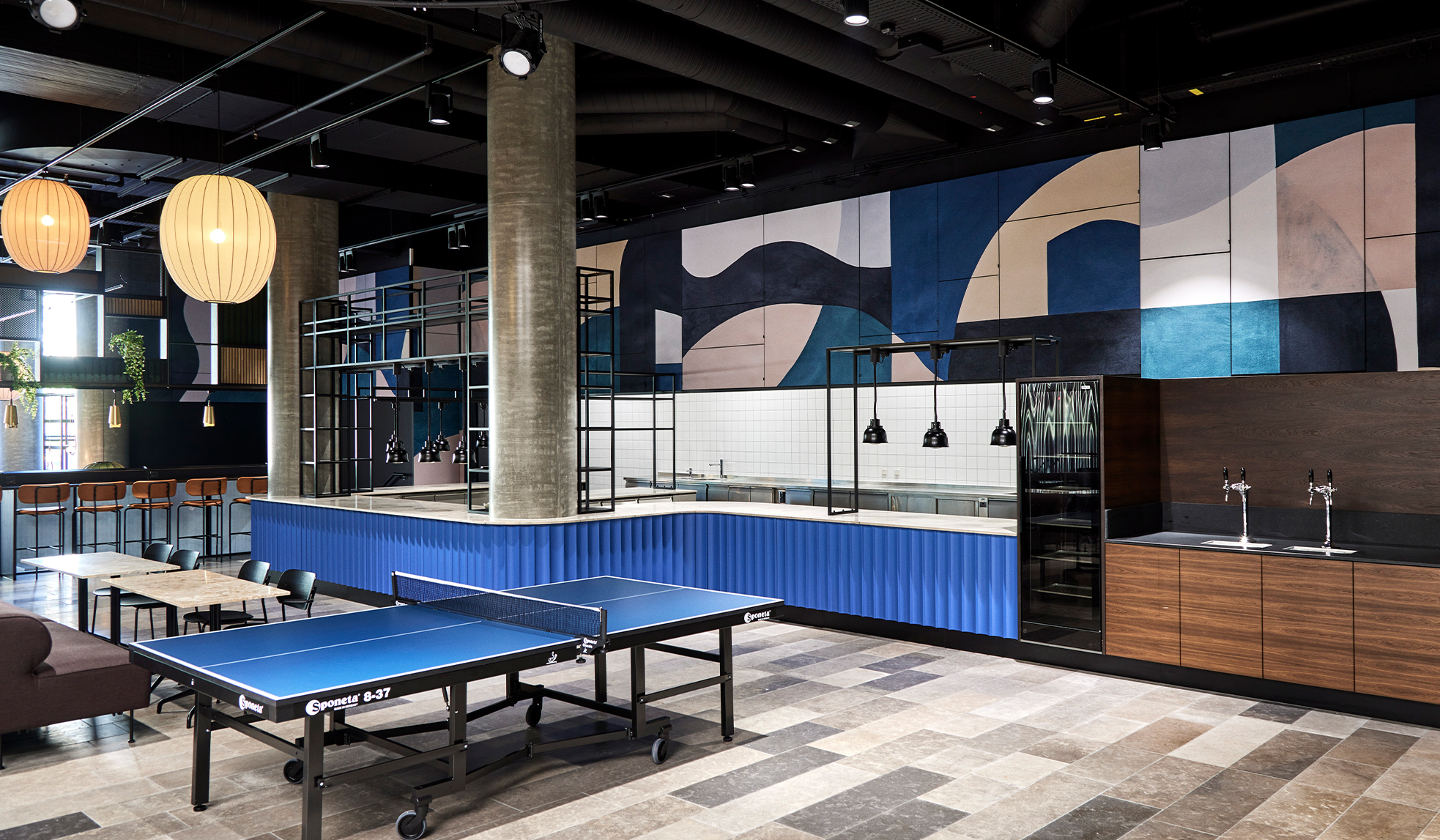 The center-piece of HUB Nordic’s event space is a stunning 4×30 meters artwork by danish designer and artist Berit Mogensen Lopez. The art piece was picked from Akuart’s gallery by the interior designer. It displays a digital print Berit created from painted graphic shapes. Due to the size of the acoustic wall at HUB Nordic, the artwork had to be enlarged. To ensure a clear resolution, the piece was repainted. This was then followed by a digitisation process.