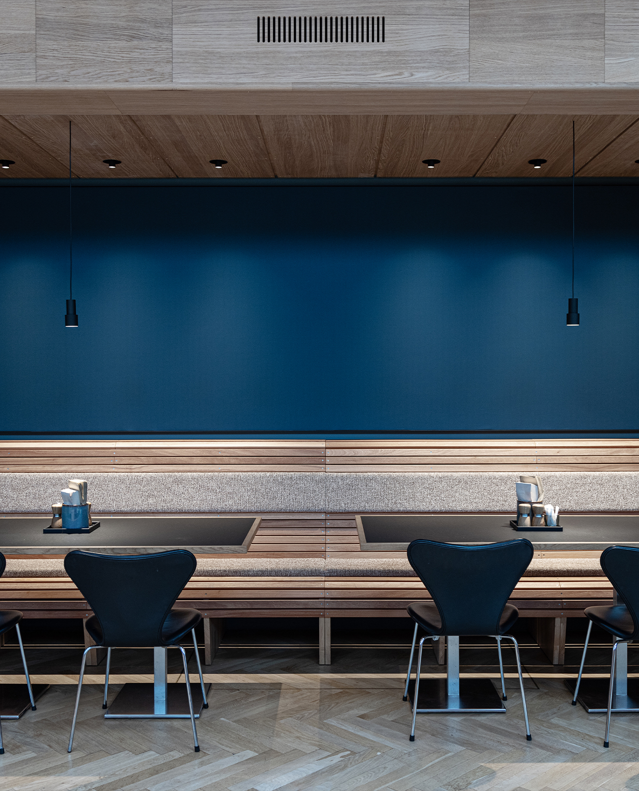 With regards to both the architectural heritage and the intended use of the room, the interior of the bistro creates a warm and welcoming community feeling for all visitors. The calm atmosphere is emphasised with the use of wood, natural light and a palette of deep blue colours, soothing the nerves and letting you thoughts wander to the the outdoors