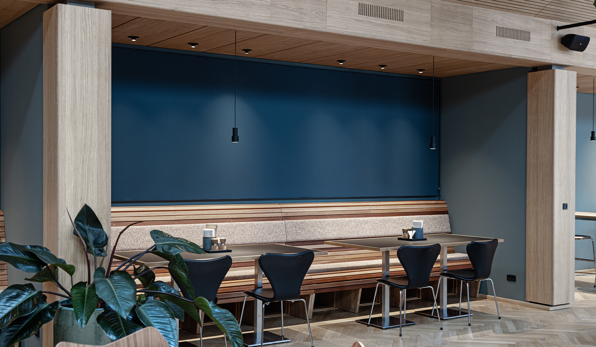The monochrome acoustic solution contributed by Akuart has been elegantly incorporated in the table nooks and supports the understated and honest feel of the room, while creating a sound environment that embraces both formal debate, calm conversation and collegial banter.