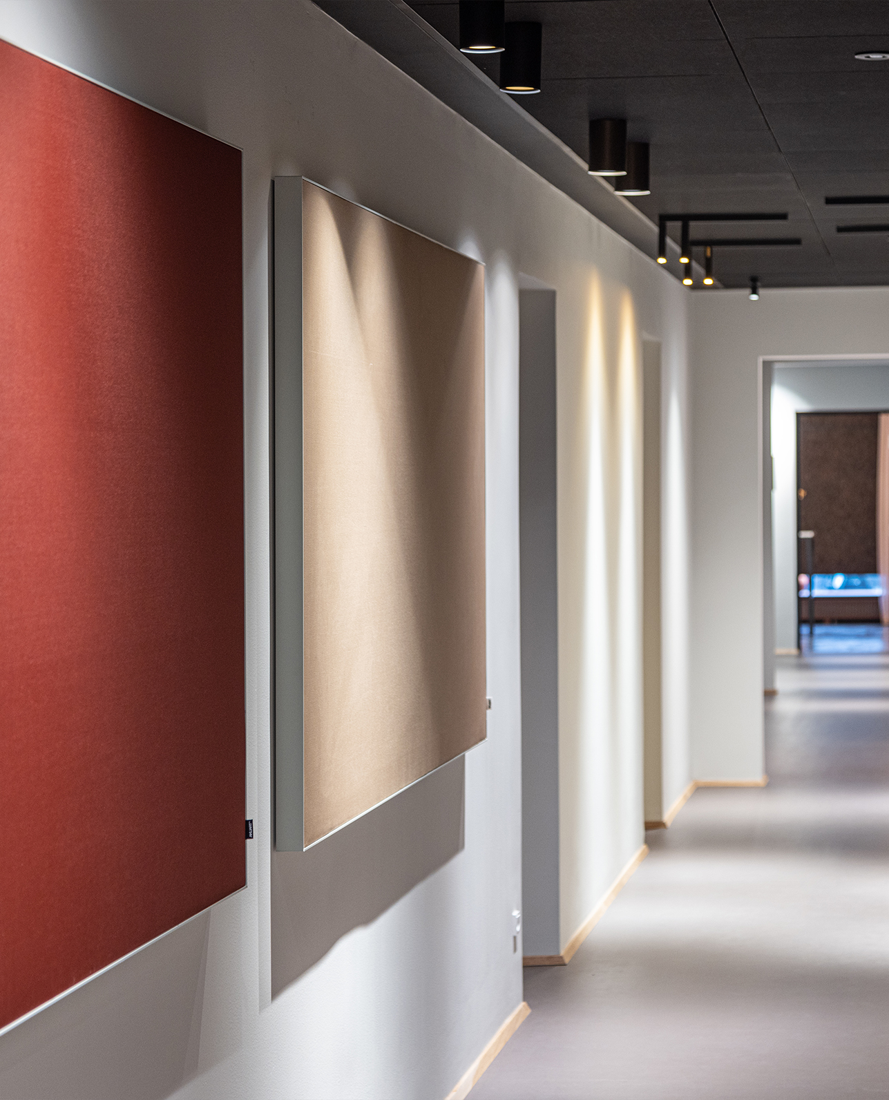 In the hallways the Akuart Supersonic Wall Panels support the interior colour palette and create a calm atmosphere with soft tones carefully selected from the Akuart colours and textures collection.