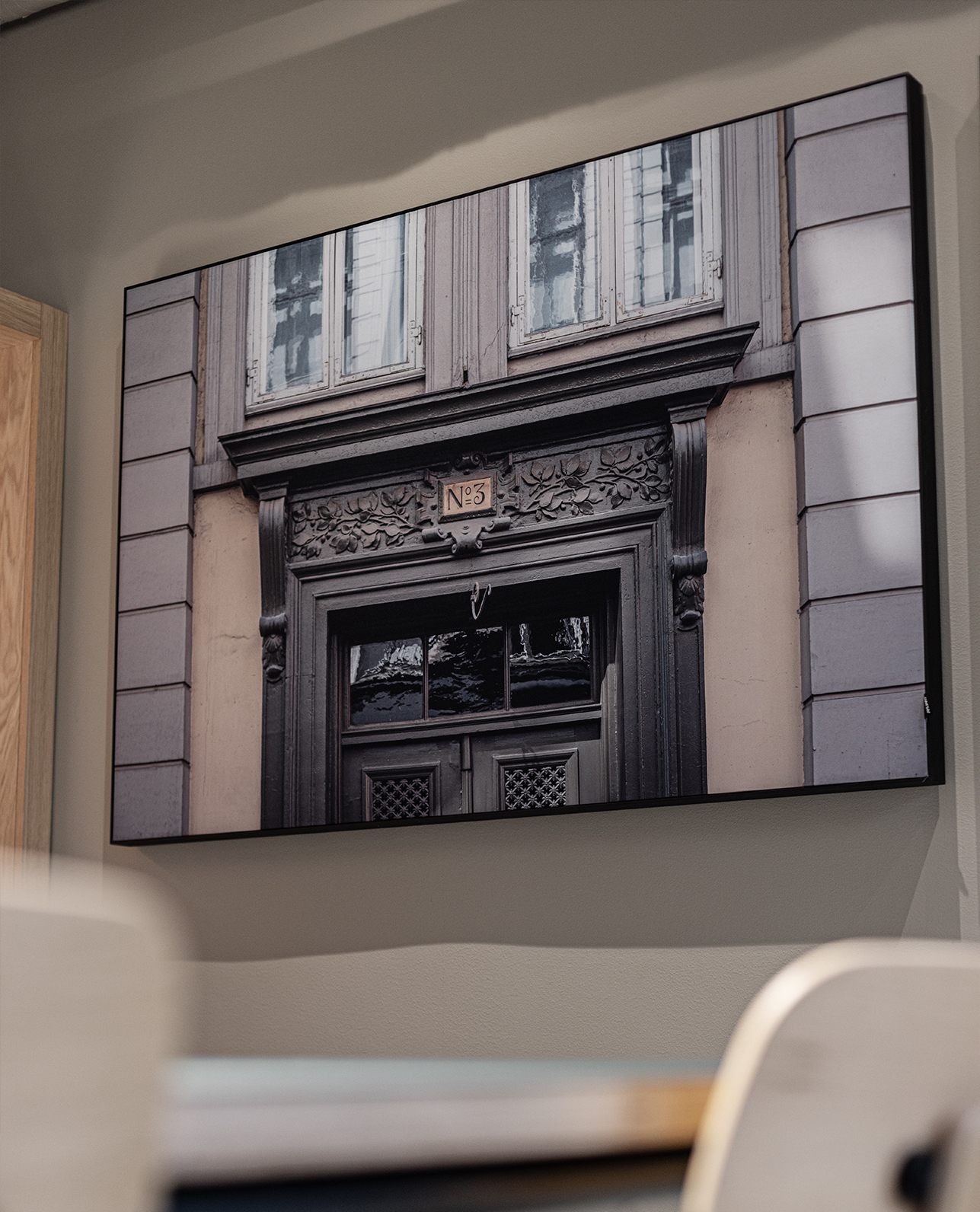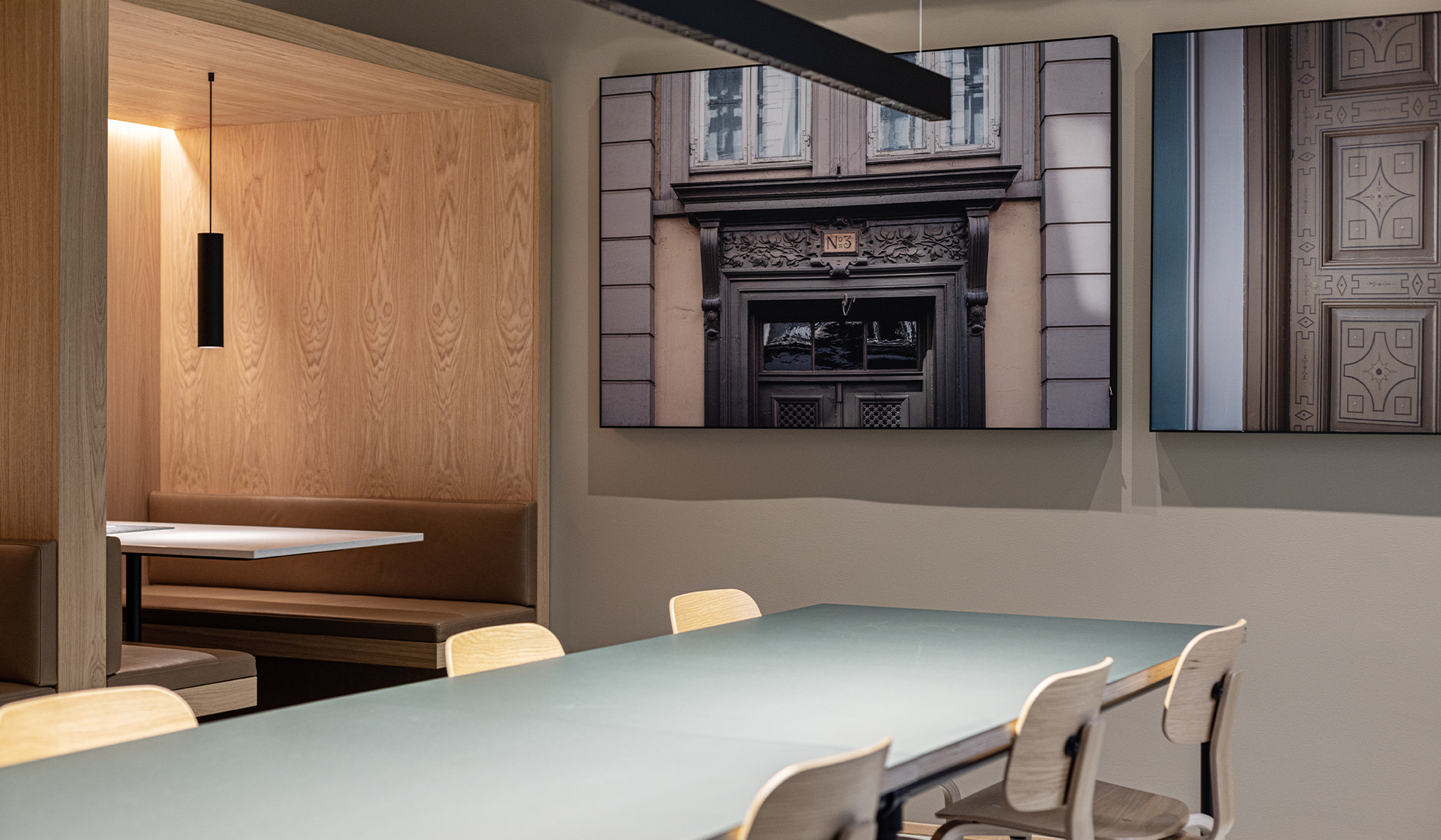 The acoustic solution was developed in collaboration with Jeudan’s design team and is kept in line with the aesthetic and functional intentions of the showroom. Throughout office areas, meeting rooms and creative spaces the acoustic wall panels are decorated with bespoke artwork telling the story of Jeudan’s passion and respect for historical buildings with photographs of architectural details from the buildings in their portfolio.