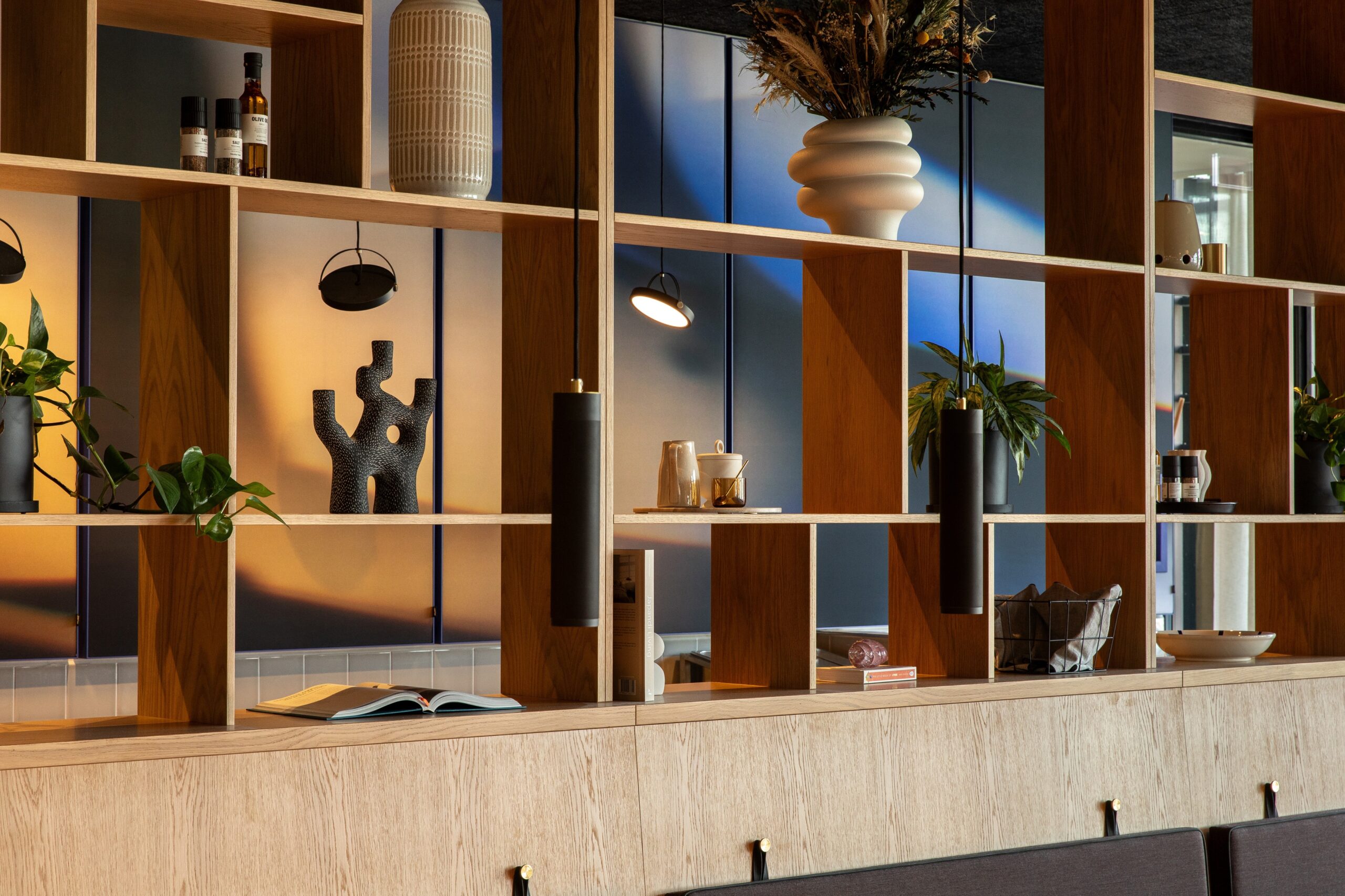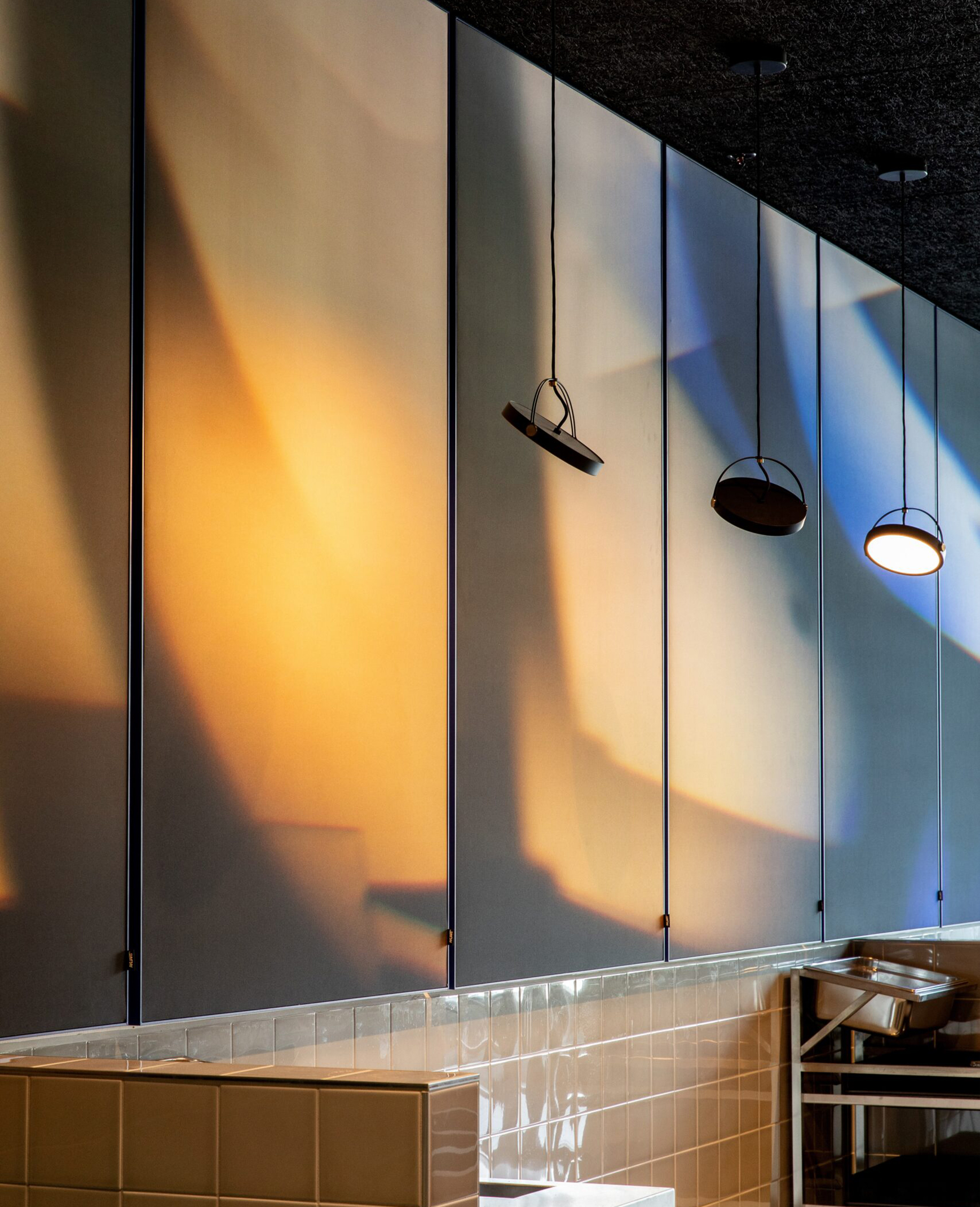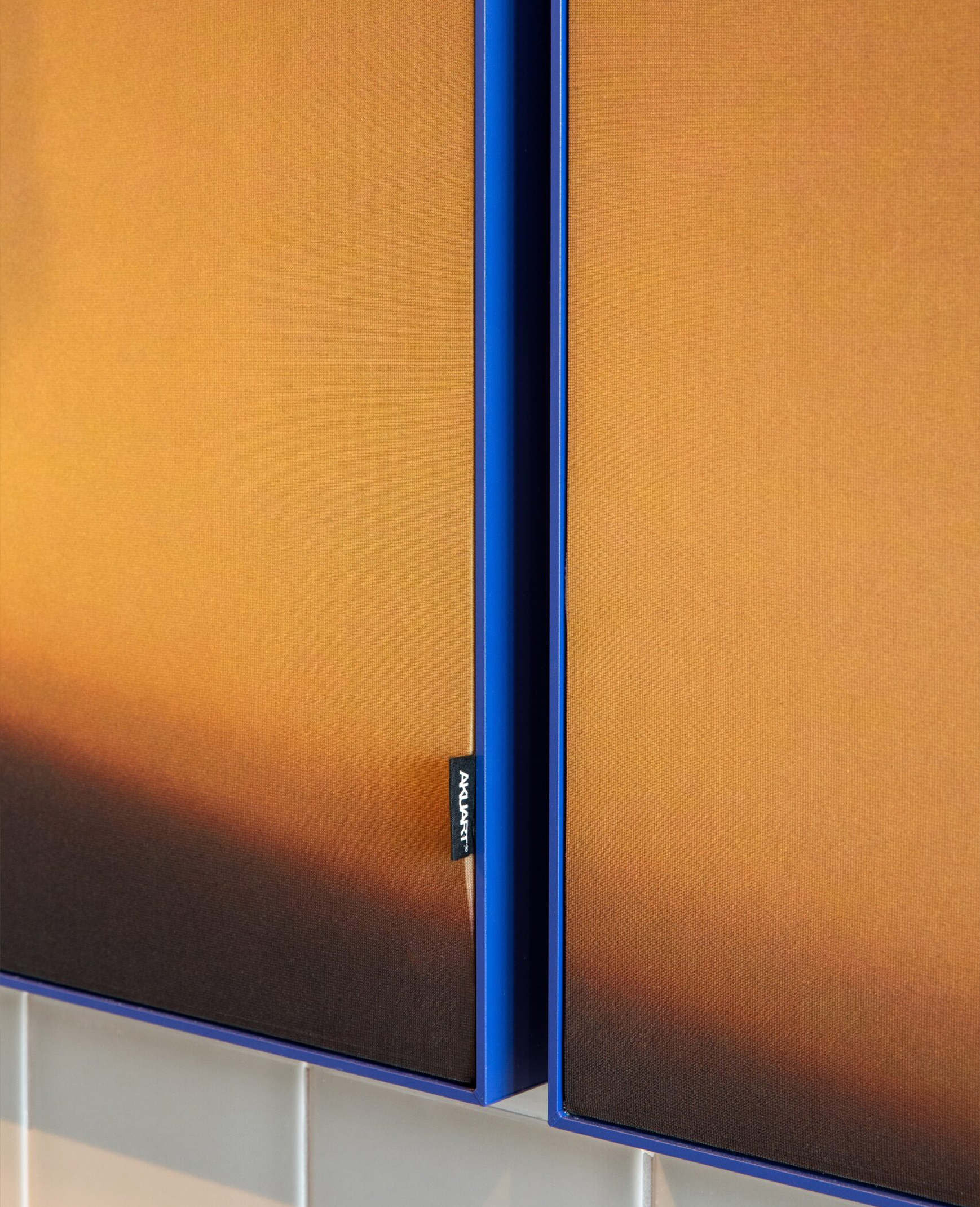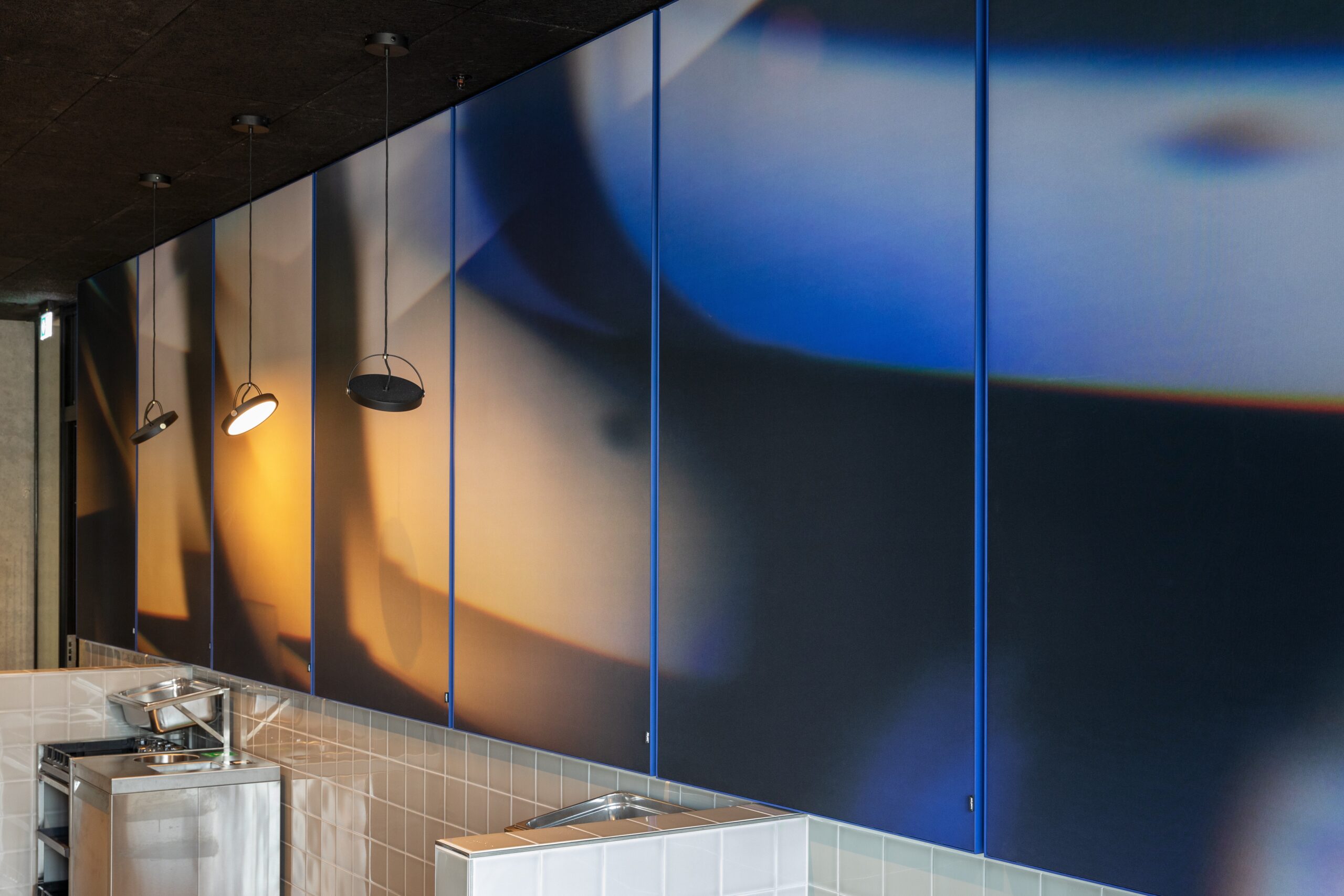 A stunning 30-metre-high glass installation by artist Mette Colberg graces the entrance of Krystal House, serving as a breathtaking focal point for the building. Known for her innovative work with glass and photography, Colberg’s piece inspired the cohesive design of the bistro. Her unique technique—using custom camera lenses to capture the interplay of light and colour—became the driving force behind the aesthetic choices in the dining area. To support both the acoustic needs and artistic aesthetic of the bistro, Akuart provided Supersonic Wall Panels in custom sizes featuring Mette Colberg’s artwork named “Lightwave”. The Accent Blue frame panels were tailored to meet the acoustic specifications, the artistic vision and ensure an overall harmonious connection with the overall design of the space.