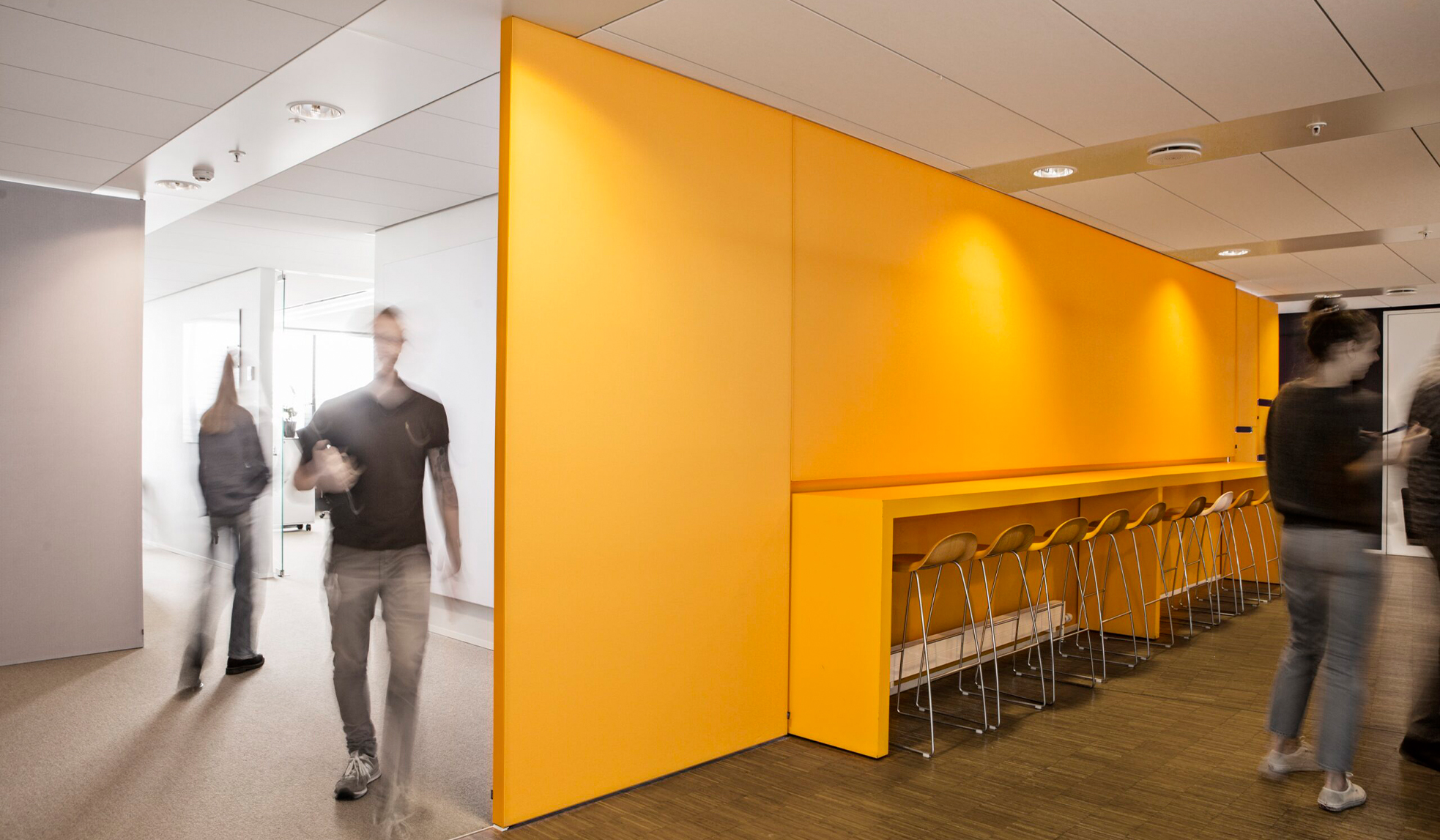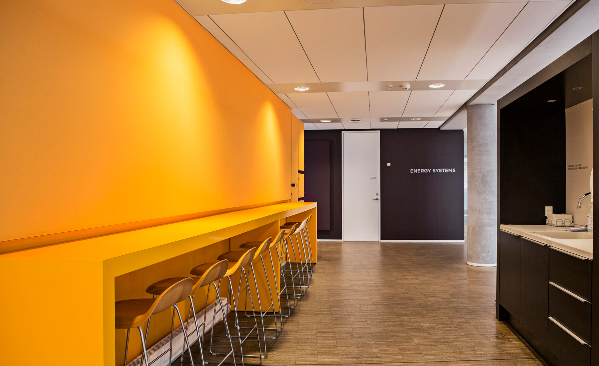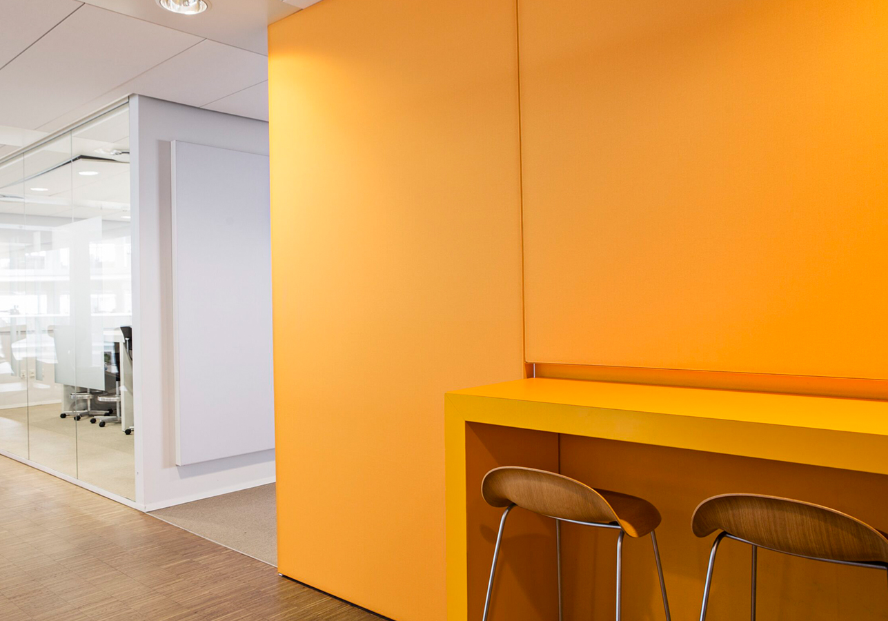 Based on Ramboll’s measurements, we defined the optimal acoustic treatment of nearby walls in the coffee machine areas as well as sound corridor enclosures. The solution involved a mix of wall panels, suspended panels and custom acoustic sound-absorbing walls.