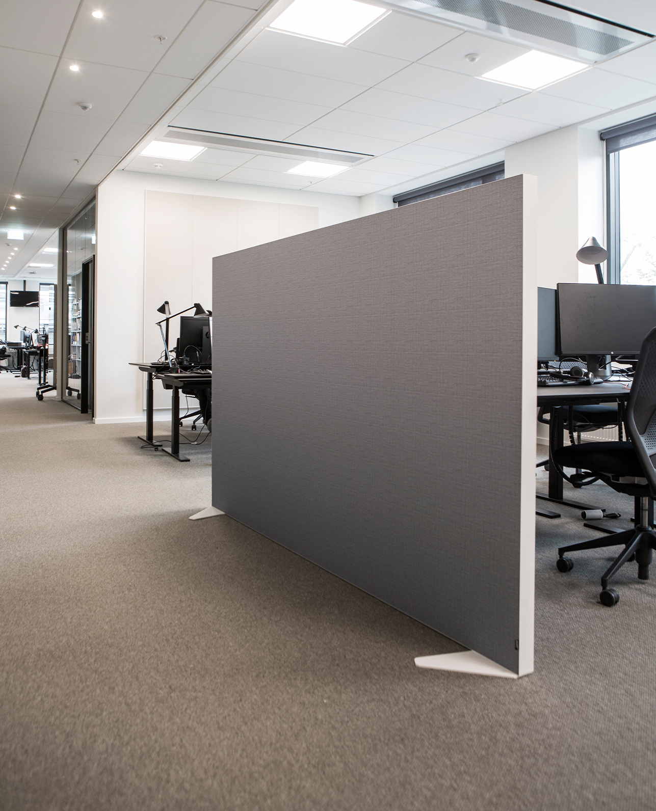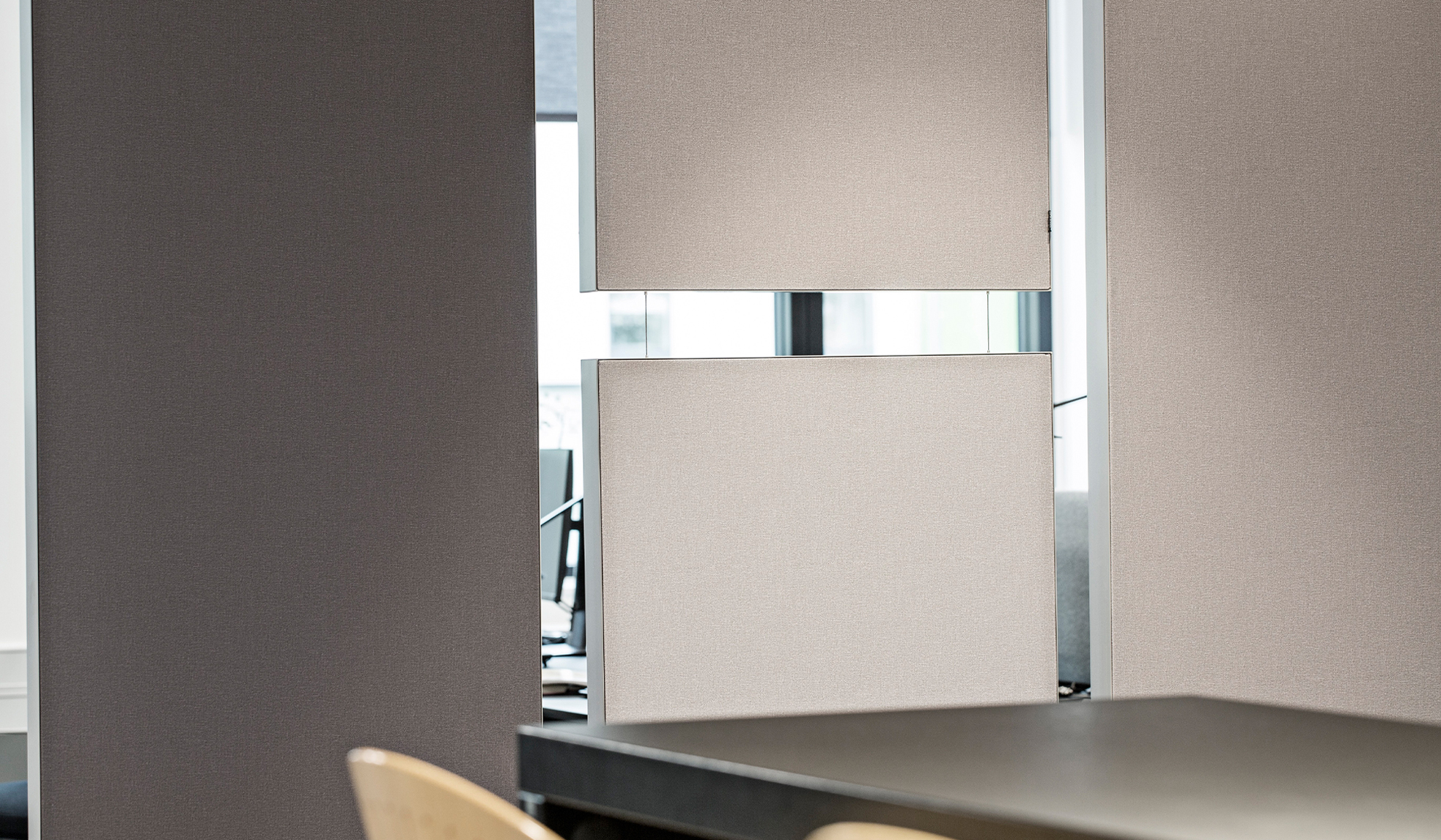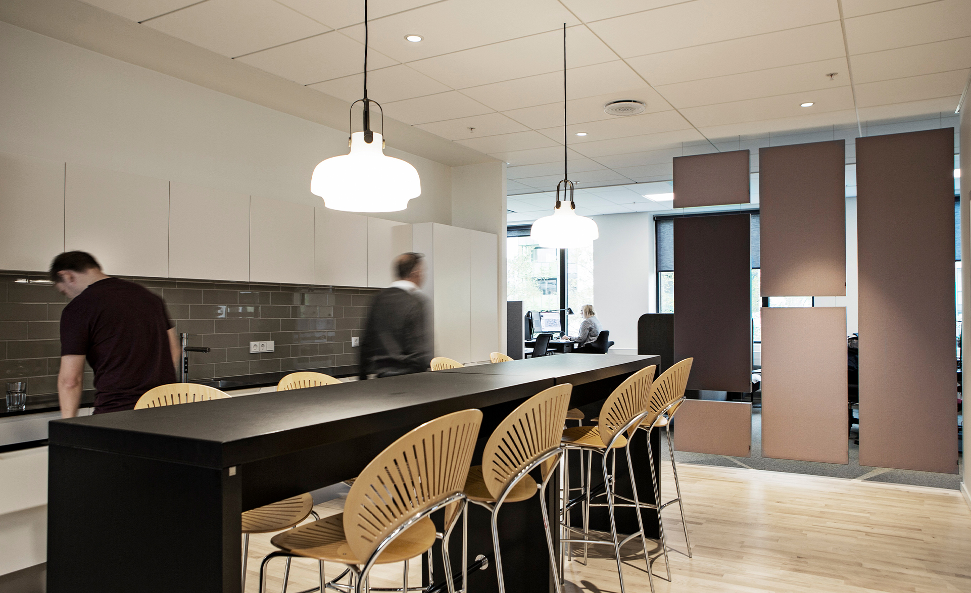 To solve the noise problems an effective acoustic solution was needed in order to create a balanced and pleasant sound environment. Sweco partnered up with AKUART’s acoustical department defining a solution that would both contain as well as absorb the sound from the noisy coffee machines. A combination of AKUART wire suspended panels, floor screens and wall panels were chosen to reshape the sound environment into a more pleasant experience for the employees.